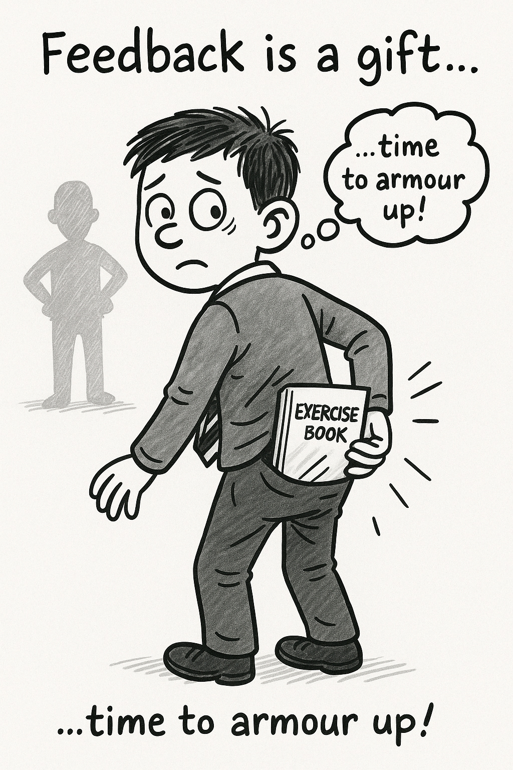 I remember my old boss used to say, “Andrew, feedback is a gift.” What that really meant was: brace yourself, you’re about to get some. I’d half-jokingly slip an exercise book down the back of my trousers for protection. Because nine times out of ten, the “gift” felt more like a slap than something useful.